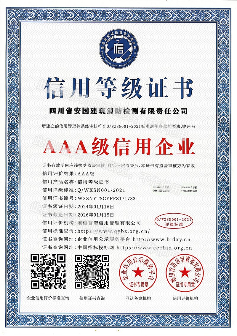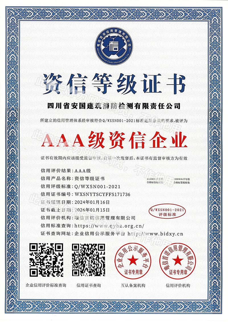 四川省安國建筑消防檢測有限責(zé)任公司,成立于1998年,經(jīng)四川省公安消防總隊批準,工商部門注冊的獨立法人單位。 公司具有建筑消防設(shè)施檢測、電氣防火安全檢測、維修、保養(yǎng)及技術(shù)咨詢一級資質(zhì)的中介技術(shù)服務(wù)機構(gòu),獲得CMA計量認證。主要業(yè)務(wù)范圍是:接受建設(shè)單位或有關(guān)單位委托,承擔(dān)新建、改建、擴建建筑自動消防設(shè)施技術(shù)檢測、電氣防火安全檢測、以及承接建筑消防設(shè)施維護保養(yǎng),對已交付使用的建設(shè)消防設(shè)施的運行情況進行運行檢測,開展建筑消防設(shè)施的消防安全技術(shù)咨詢。公司設(shè)辦公室、總工辦、財務(wù)部、檢測部、維保部等職能機構(gòu),擁有一